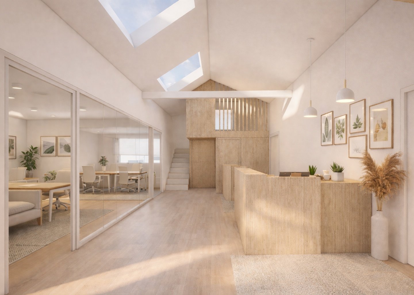 Le choix d’occuper la totalité du volume cathédrale s’est imposé dès l’esquisse. Celui-ci nous a permis d’augmenter la surface de plancher en intégrant la mezzanine recevant la salle de pause. L’augmentation du nombre de bureaux avait pour but la création de différents pôles au sein de ce même office. Une vraie salle d’attente s’est imposée au centre du bâtiment de manière à faciliter les circulations entre les occupants et les clients.